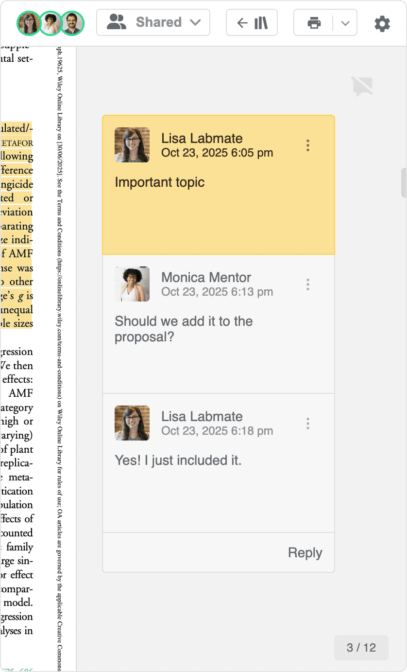 Work together on PDFs in Paperpile by adding highlights and comments directly in shared documents. Everyone with access can see annotations in real time, reply to comments, and follow who contributed. For details on sharing settings and collaboration options, see Sharing in the new Paperpile.