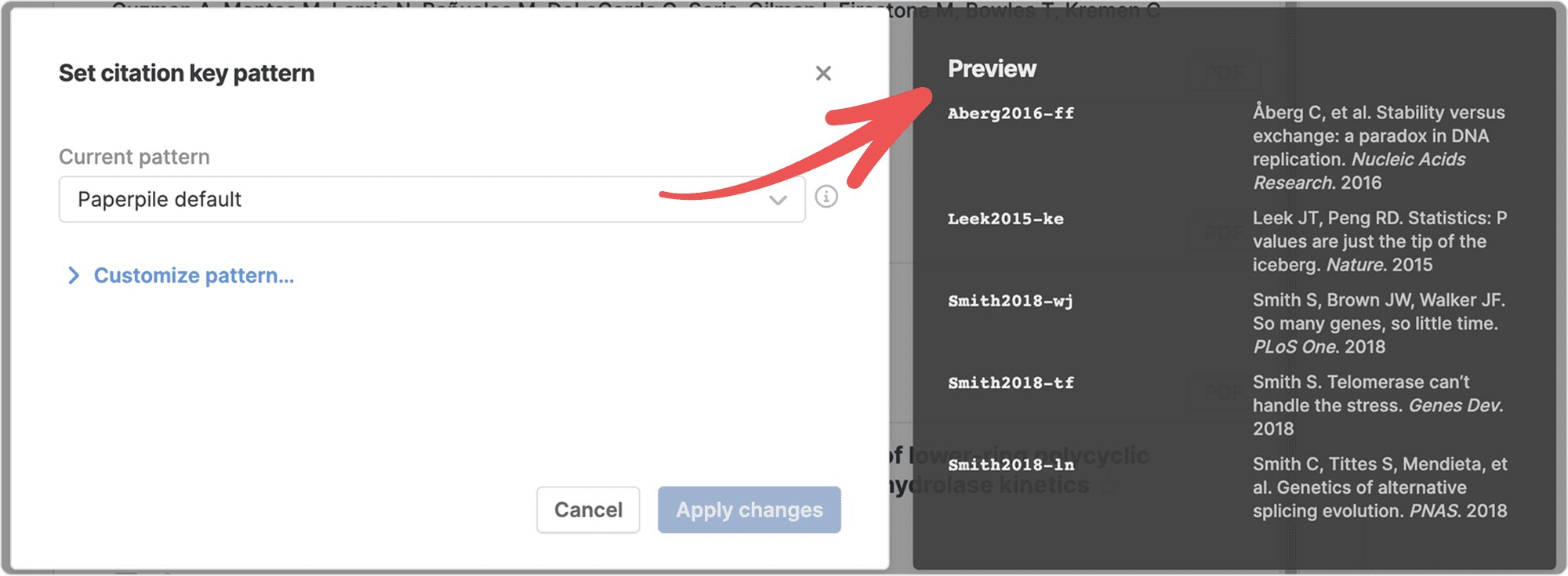 Some citation keys in your library may not follow your automatic pattern. If you have keys that you have set manually, or if you have imported references with the Paperpile mobile apps, you can change all of them to your chosen pattern in a few steps.