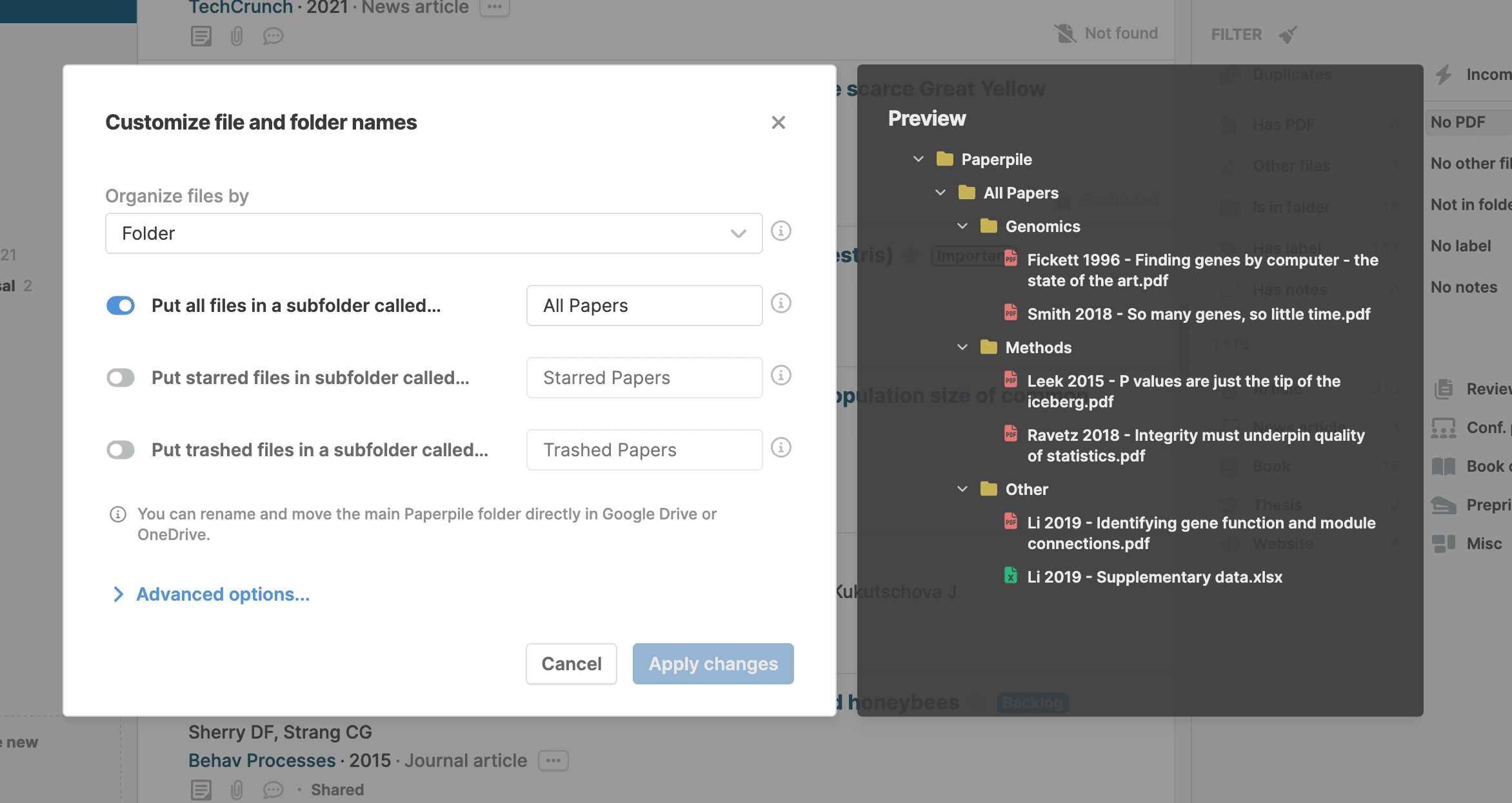 • The files you upload to Paperpile are also saved on our servers and are backed up. You can choose to sync those files to your Google Drive. So you have complete control over those files. For example, you can sync all of them to your local hard disk.