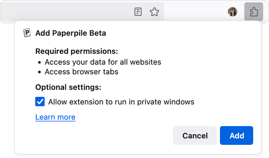 These permissions let the Firefox add-on automatically detect citation information and save references seamlessly. Paperpile adheres to our published privacy policy, and uses only the minimum permissions required to provide a high-quality service.
