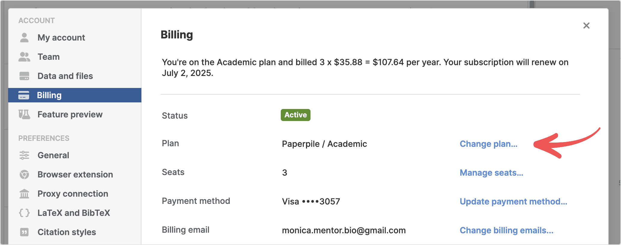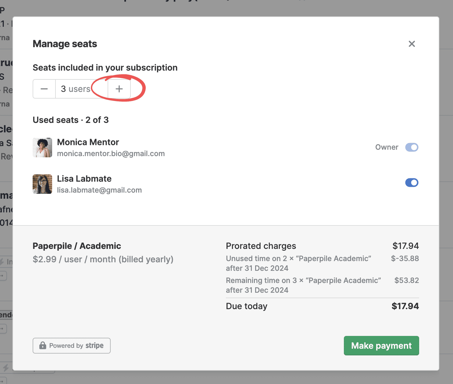 • If your subscription doesn’t have enough free seats for new users, a new seat will be added to your subscription (you will be prompted for confirmation). Each seat is only charged for the remaining time of your current billing period (see Paperpile subscriptions explained).