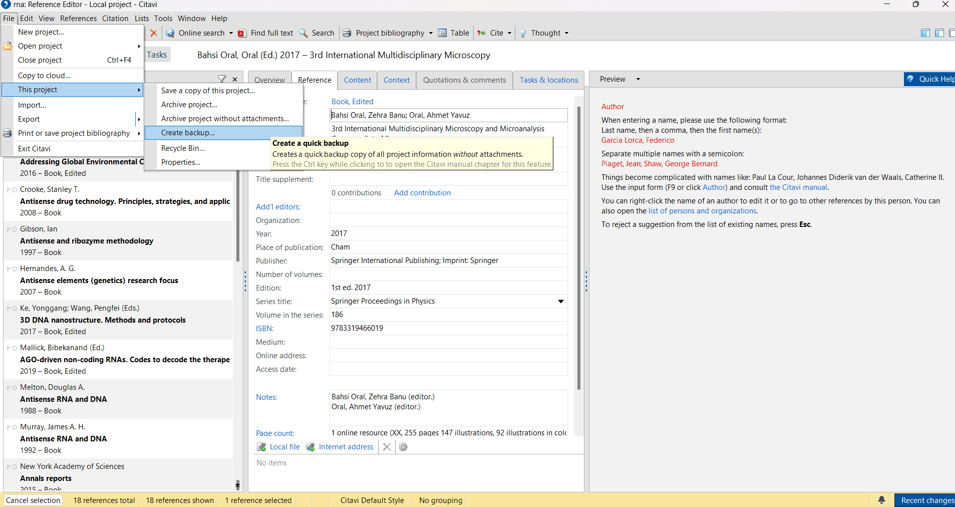 - Open Citavi and create a backup of your project. You will find this option in the File menu.