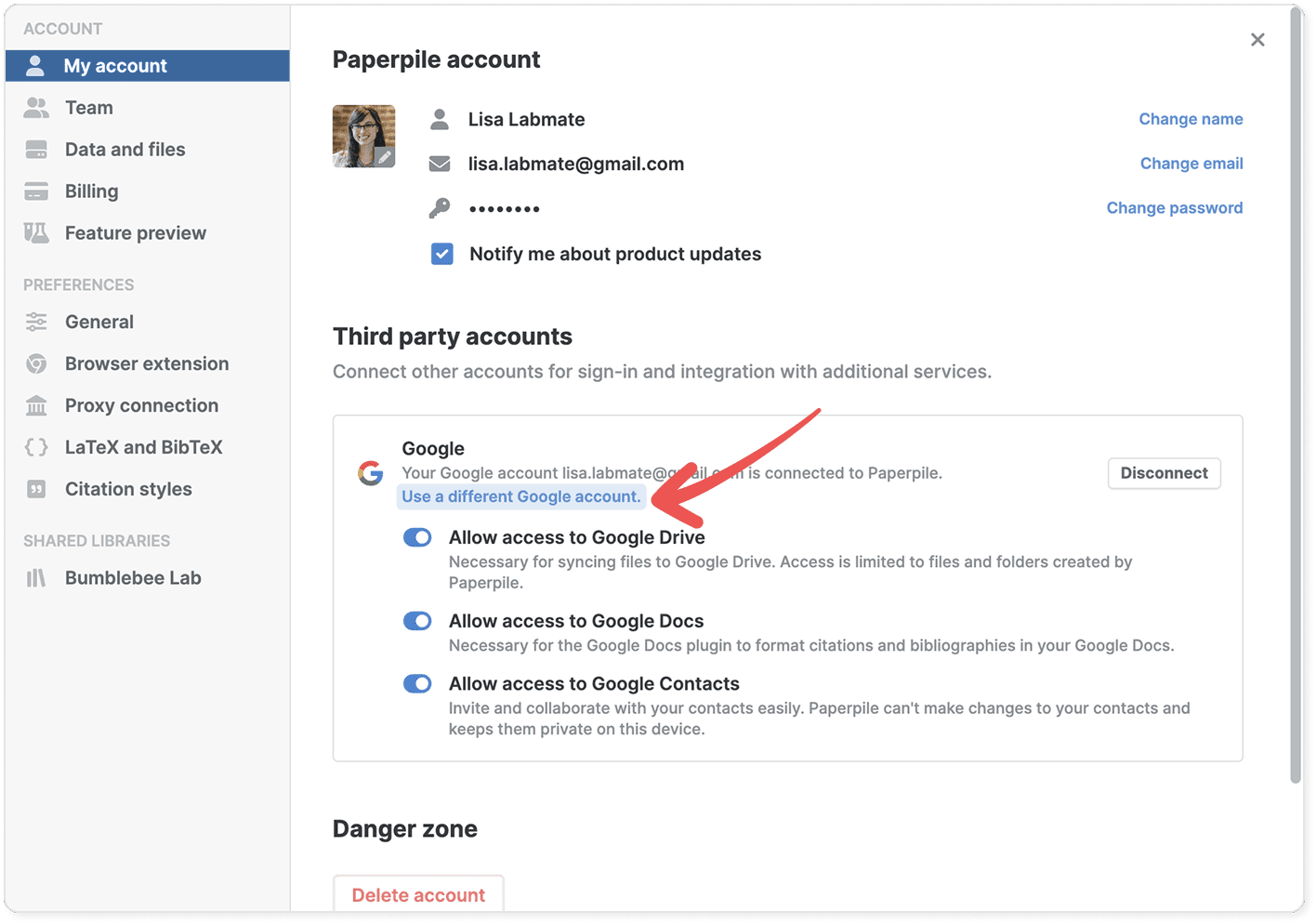 Important: The Google account you switch to must not already be linked to another Paperpile profile.