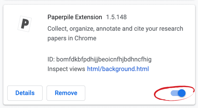 If Paperpile shows a message "Lost contact with Chrome extension" or Paperpile is behaving strangely in some other way, reloading the extension might help. Go to the extension tab and disable and then re-enable the extension.