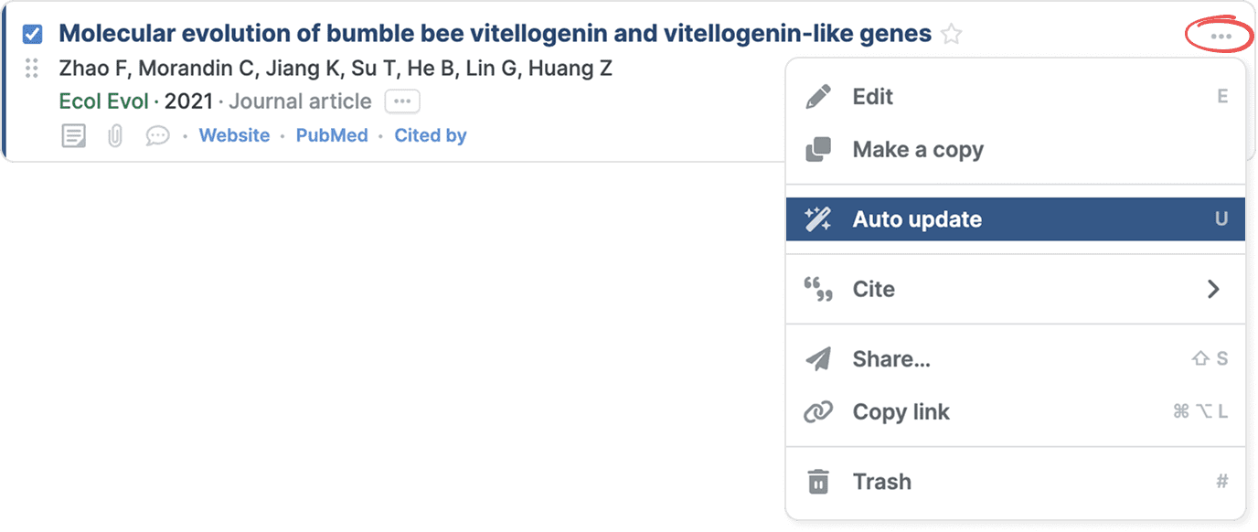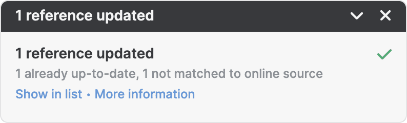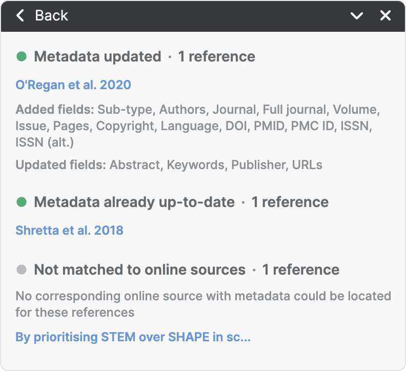 Keep your reference metadata accurate and complete by automatically updating it from academic databases. This is particularly useful when you've added references with incomplete information or when you need to fix errors in bulk.