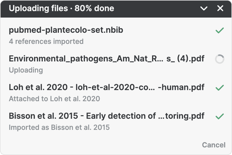 You can upload bibliography files and PDFs to quickly build your Paperpile library from references you already have on your computer.