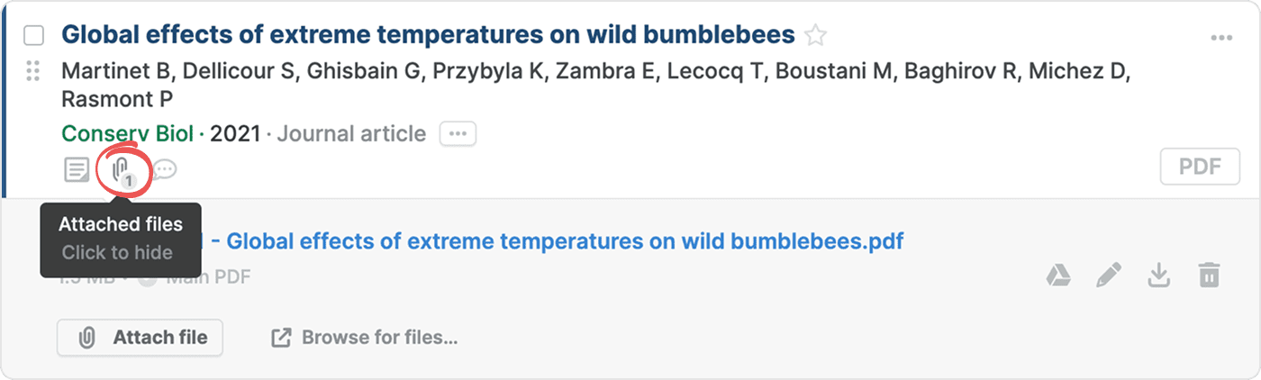 Note: You can attach any type of file to a reference in your library. Click the paperclip to show the files panel and the option to Attach file.