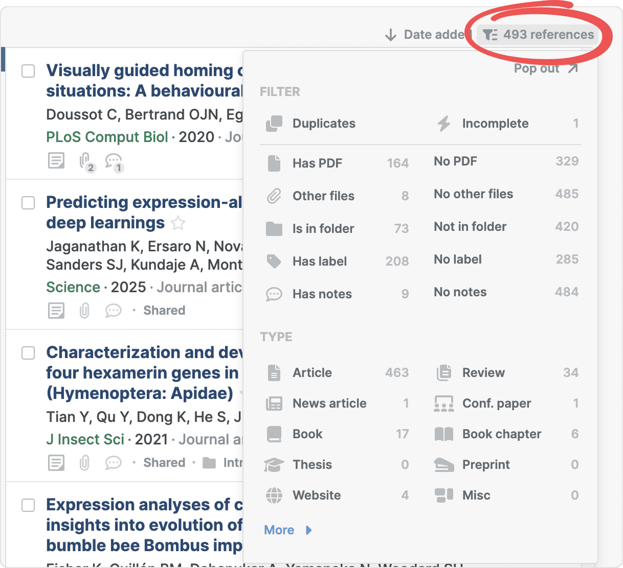 You can combine folder and label selections with filters from the filter menu like "Has PDF", "Has notes", or reference type). All filters work together to narrow your results.
