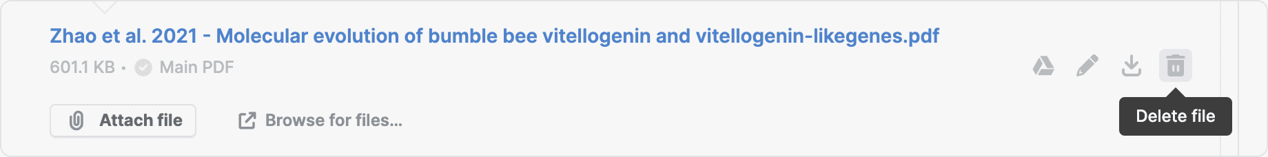 To remove a file from a reference, click the paperclip to show the files panel and find the file you want to delete. Click the trash button next to it to delete the file.