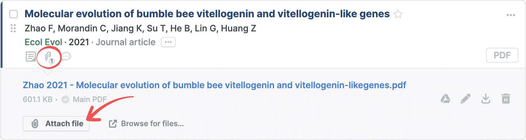 Paperpile will upload the files and add them to the reference. You can attach PDFs, images, spreadsheets, text files, and other file types you want to keep with your references. You can attach as many files to a reference as you want.